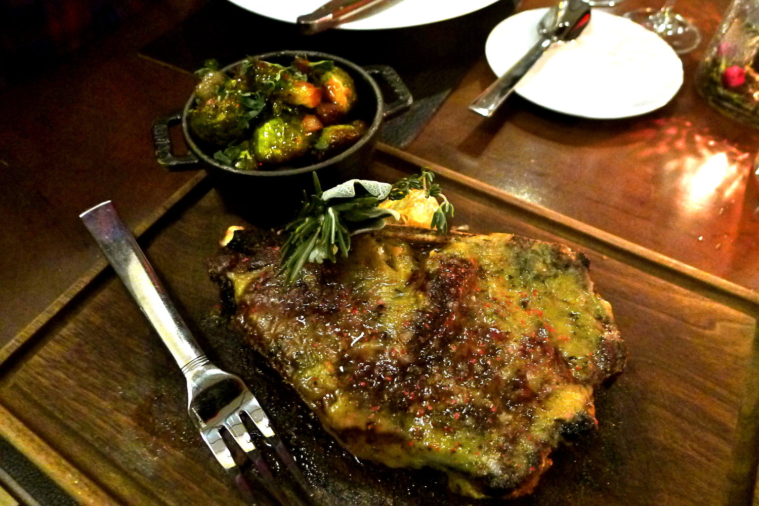 The entrees arrived, again on dark wooden trays, and let me just take a moment to discuss the attention to detail here. Each steak knife is engraved with Salt&Char on the blade, a smart branding move, and the serving “dishes” are unique and top of the line: Staub mini-cocotte for the brussels, Mauviel saucier for the au poivre sauce and a beautiful walnut cutting board for the main event, the rib eye, also served with a bundle of fresh herbs, a quarter head of roasted garlic and a sprinkle of pink Himalayan sea salt. Cooked perfectly at a pink medium rare, the steak was top notch- so wonderfully flavored and tender that I didn’t even feel like I wanted to change things by adding the au poivre sauce. And that’s saying a lot considering the au poivre was perfectly peppered and creamy. The lamb shank was equally as decadent, falling off the bone and into the dark, rich glacé and bed of russet potatoes it was sitting on. The brussels sprouts were deliciously roasted and paired well with the bacon and the crunch of the cipollinis. We were silent for several minutes during this time period. There are a lot of good things that come with a 20oz. dry-aged prime NY strip, the bad thing, for me, is that it’s 20oz. and I can’t finish it in one sitting- no matter what kind of valiant effort I make. Silver lining here though is that it gets new life in tomorrow morning’s eggs, tomorrow’s salad or maybe even tomorrow’s dinner.