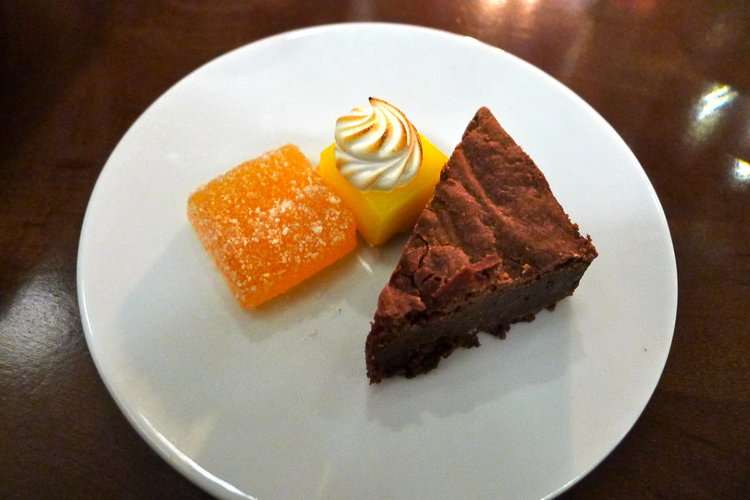 Now I know I’ve gone on and on, but I just have to mention the dessert that we managed to fit into our bellies to top this whole thing off. Out of many delightfully unique offerings, we chose what our waitress aptly described to be like one of those caramel-filled Ghiradelli chocolate squares, a description that got me hook, line and sinker. The salted caramel and chocolate tarte with Grand Marnier crème anglaise, poured table side, was a dessert-lovers dream: gooey caramel, crunchy chocolate cookie, creamy crème anglaise. The pièce de résistance was a citrus sherbet, something that was completely unexpected with a chocolatey dessert, that added a coldness and a tartness that cut through the rich caramel and brought all the flavors together. Like I said, trust them at S&C, they know what they’re doing.