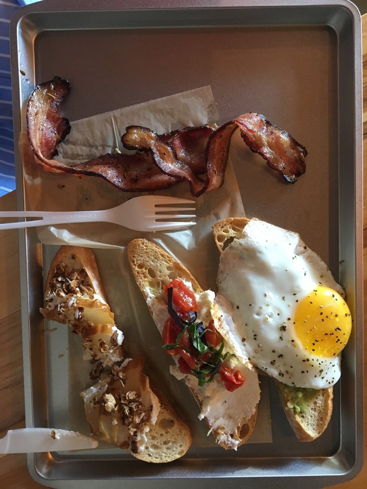 A classic breakfast sammy, The Staple gets some serious love with maple sriracha, peppered bacon and a brioche bun. The Breakfast Bruschetta really hit all the notes for me, though. Three slices of french bread each topped with a different dressing, allowing for the sweet and the savory to shine. Today’s selection included honey goat cheese, pear and granola; basil avocado topped with a fried egg; and my personal favorite, honey-roasted tomatoes and lemon ricotta. Each of the “mains” on the menu are served with your choice of a market side as well- everything from salt&pepper fries to balsamic & shallot roasted beets to a toasted coconut yogurt parfait.