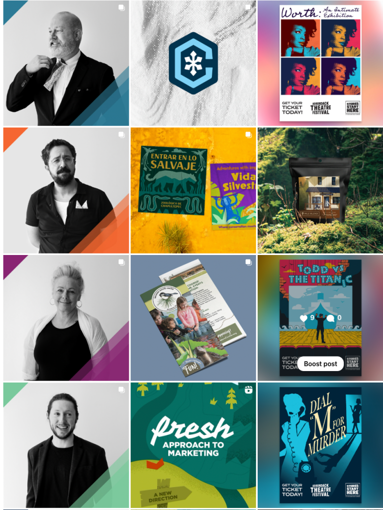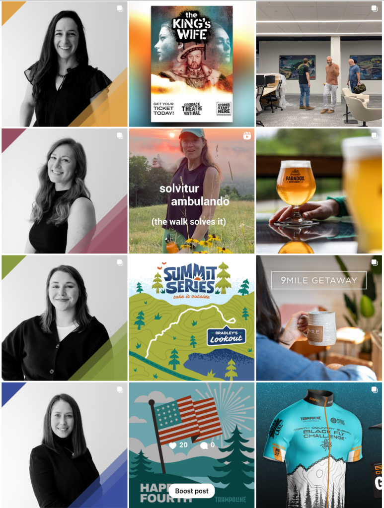 Instagram grid examples below to show content strategy, management, and caption writing, across various clientele including Trampoline Design, Lake George RV Park, the Dempsey Center, and 9 Mile Getaway.